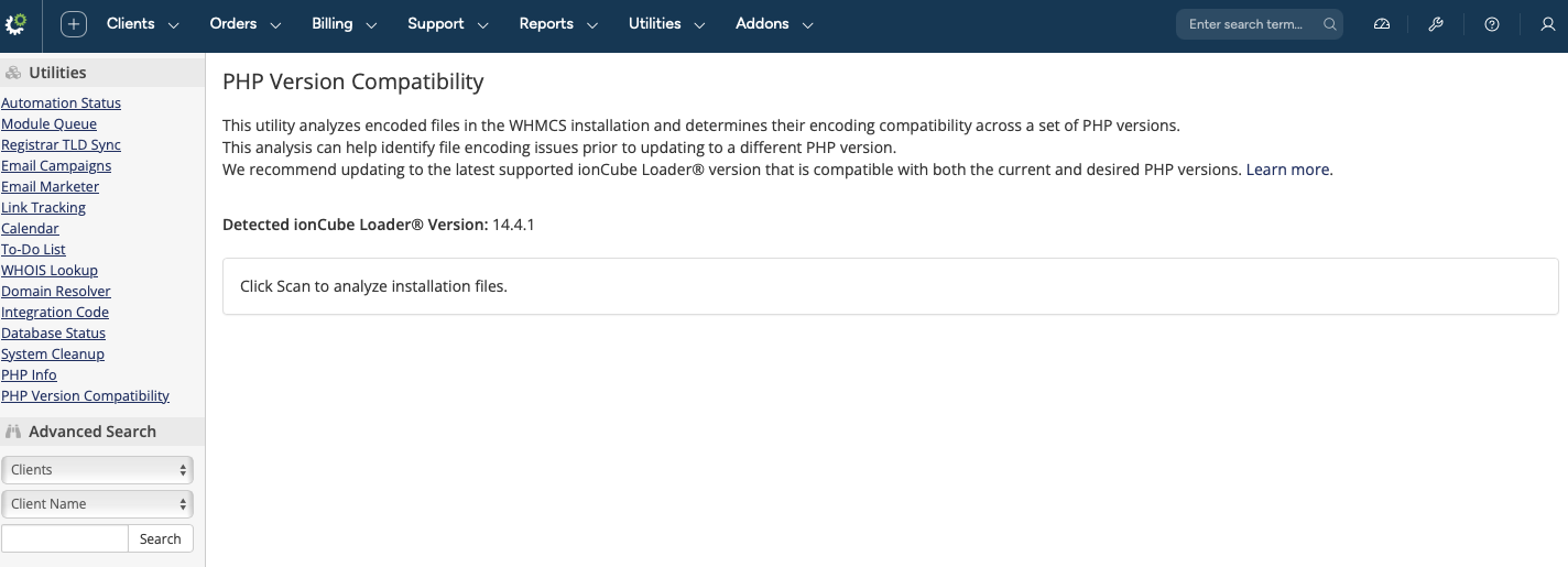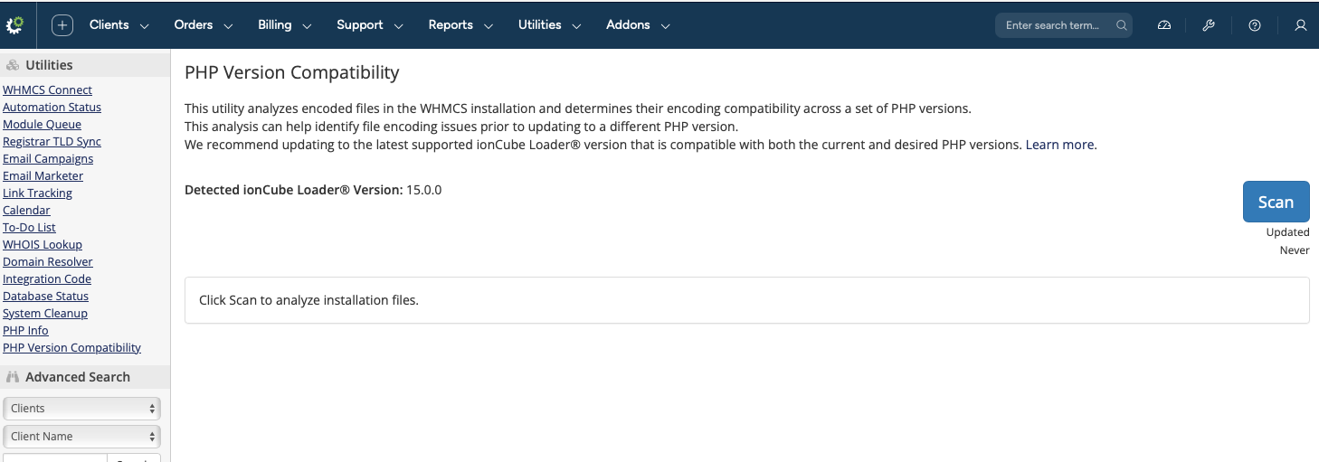 Please update the links in the admin area that point to WHMCS documentation to open in a new tab / window. Some of them already open this way and others don't. Example: on the PHP File Compatibility screen We recommend updating to the latest supported ionCube Loader® version that is compatible with both the current and desired PHP versions. Learn more. Also, where is the 'scan' button? Safari doesn't show it. I'm using the new Blend preview template