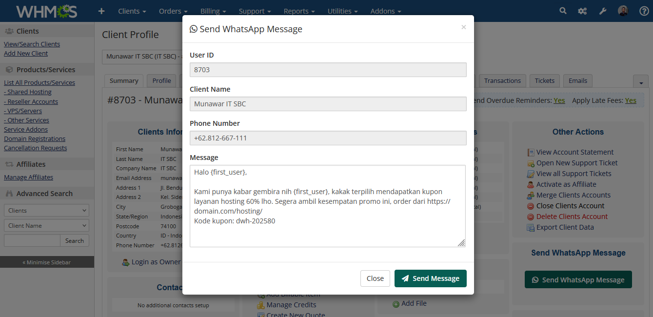 We are pleased to announce the implementation of a new feature same with our addon api based: The requested "Send WhatsApp" button on the client profile has been successfully added. Please download the latest update from the Client Area to apply this change immediately. Future Updates & Development Status: Custom Enterprise Versions (for providers using the WhatsApp Sender Addon Module) will receive the corresponding update shortly. The development of the WHMCS Bulk WhatsApp Messaging feature is currently in progress. Thank you for your continued feedback.