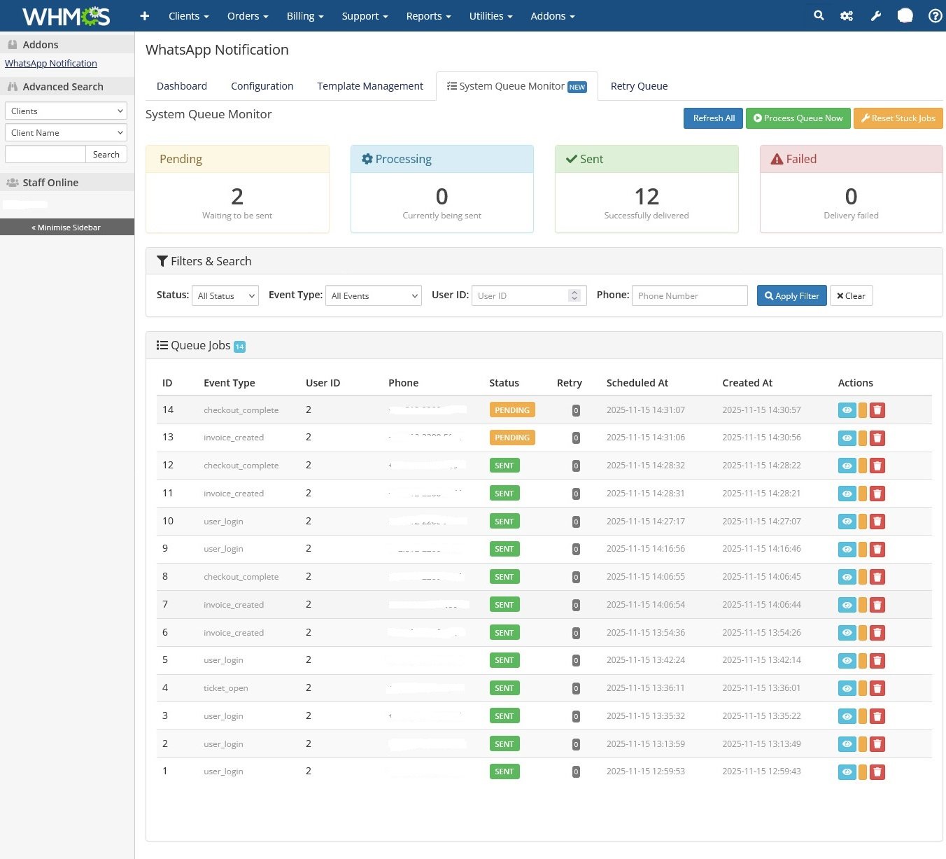 Update v 1.0.4 based on feedback from peers using this addon. Added a Monitoring system and Queue system to prevent overloading the WHMCS database during data iteration. UI and Ajax system optimization within the queue system. Added Event Type / Hook Type to the queue system. Added several event notifications. Improved error handling for compatibility with the latest WHMCS version. Optimized integration with several WhatsApp gateway providers, resolving frequent timeout issues previously experienced with one specific provider. Tested: Successfully sent 3600 messages in 1 hour to 200+ WhatsApp numbers. -