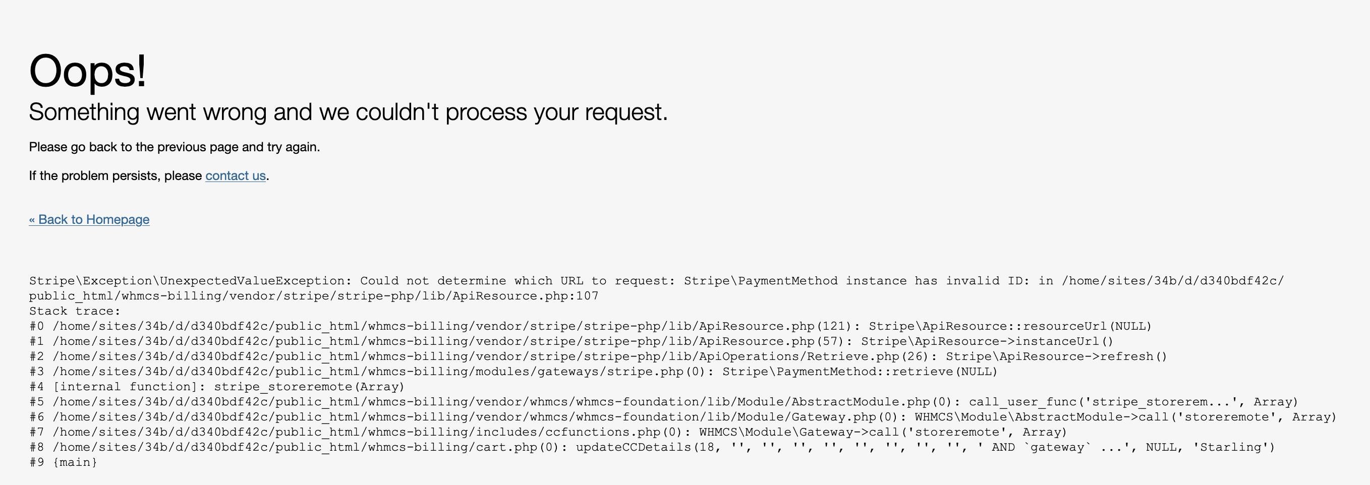 Hi there, We have recently just setup a new WHMCS environment and we are trying to get the stripe module working so we can take card payments for our business. We have tried a few test payments however we keep getting the attached error. Does anyone know how to resolve this? We have spoken to Stripe but they are pretty certain its a WHMCS issue and we need to resolve this before we launch live. Any help would be appreciated! Thanks.