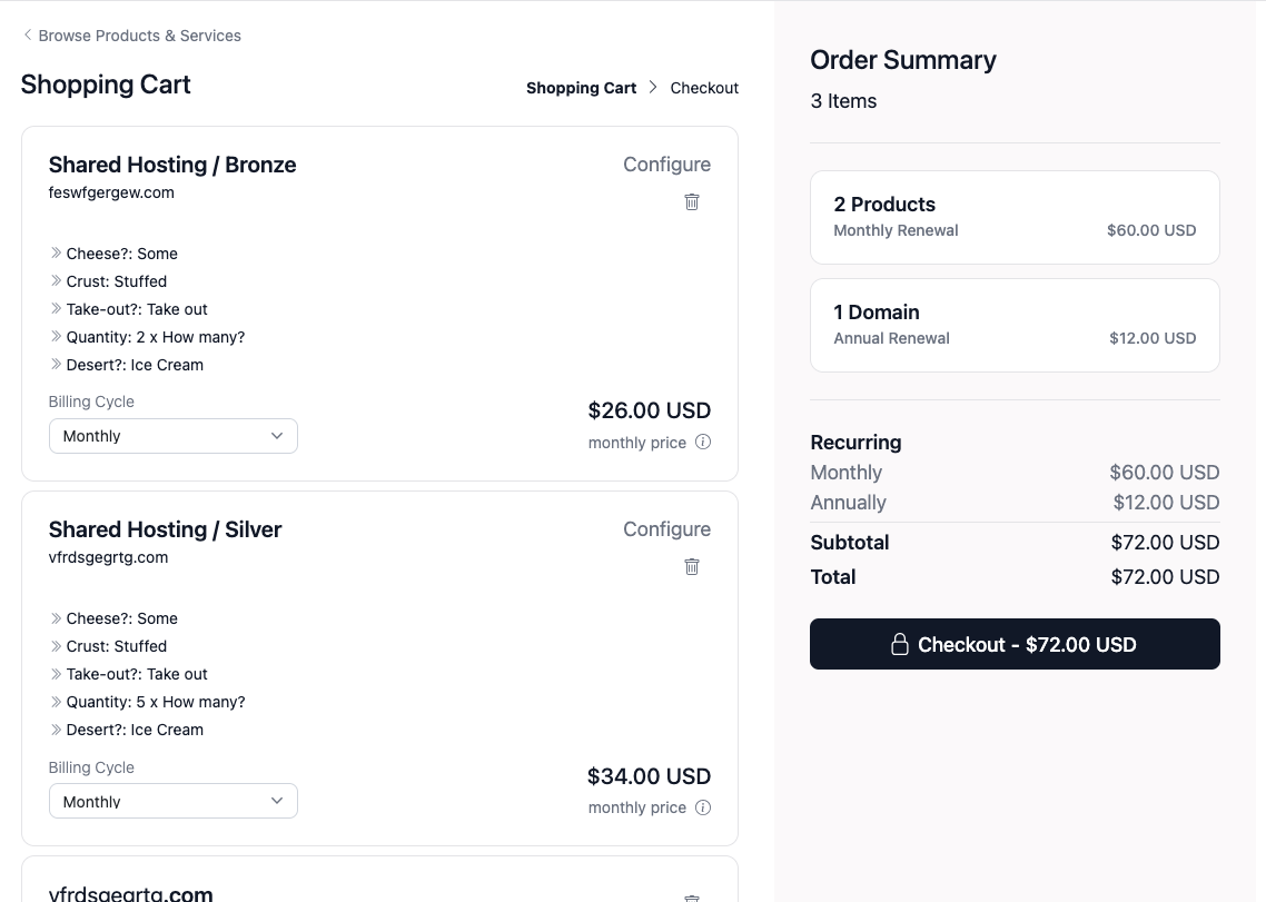 The order form doesn't work for me. No idea if it's related to that, but I just get an internal error. The exact error is logged nowhere - not in the activity log or error log. This doesn't happen if I order a domain registration or transfer - only if I order a product. I've been messing with it, and if I disable the "Assigned Options Group" under "Configurable Options", it suddenly works. If cross selling is enabled for the product, it adds the product I'm purchasing to the cart twice (even when I just click "Continue" in the modal that shows up).