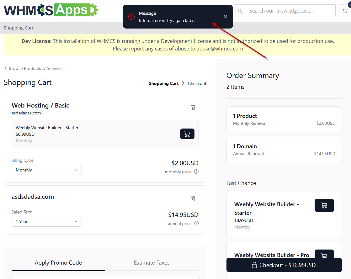 I get that error only when I make a duplicate copy of Nexus and name it as nexus2 & orderfrom/nexuscart This error I see https://whmcsurl.com/api/v2/cart/bemqMJXi9QrOcCGU/checkout [HTTP/1.1 500 Internal Server Error 981ms]