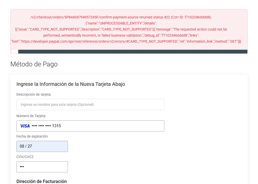 PayPal module shows raw JSON error (“CARD_TYPE_NOT_SUPPORTED”) directly to users — need help sanitizing message